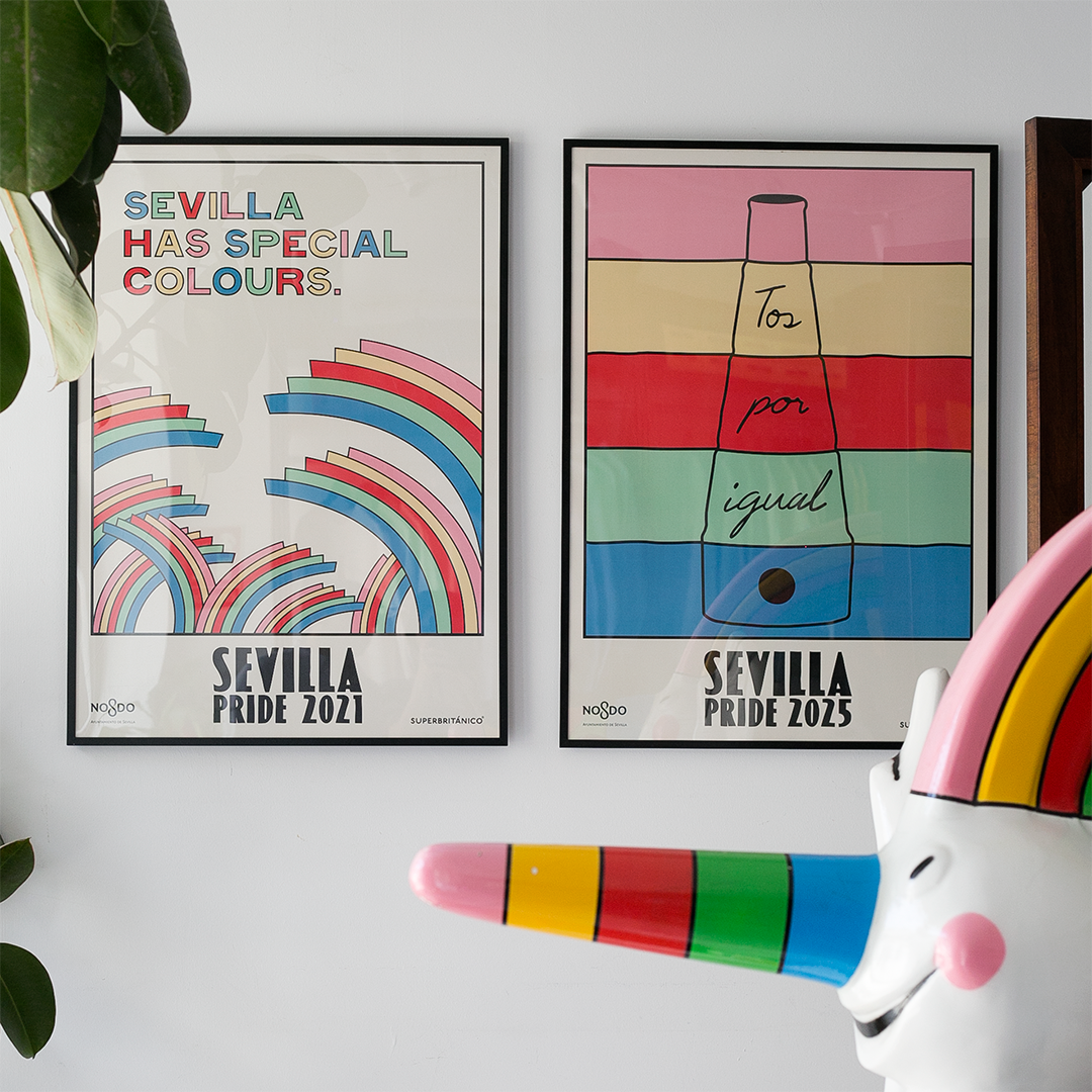Además, desde nuestros inicios hemos colaborado con diferentes artistas e instituciones como el Ayuntamiento de Sevilla con quien tuvimos el orgullo de diseñar el cartel Sevilla has special colours del mes de la diversidad sexual de 2021 y el de Tos por igual de 2025.